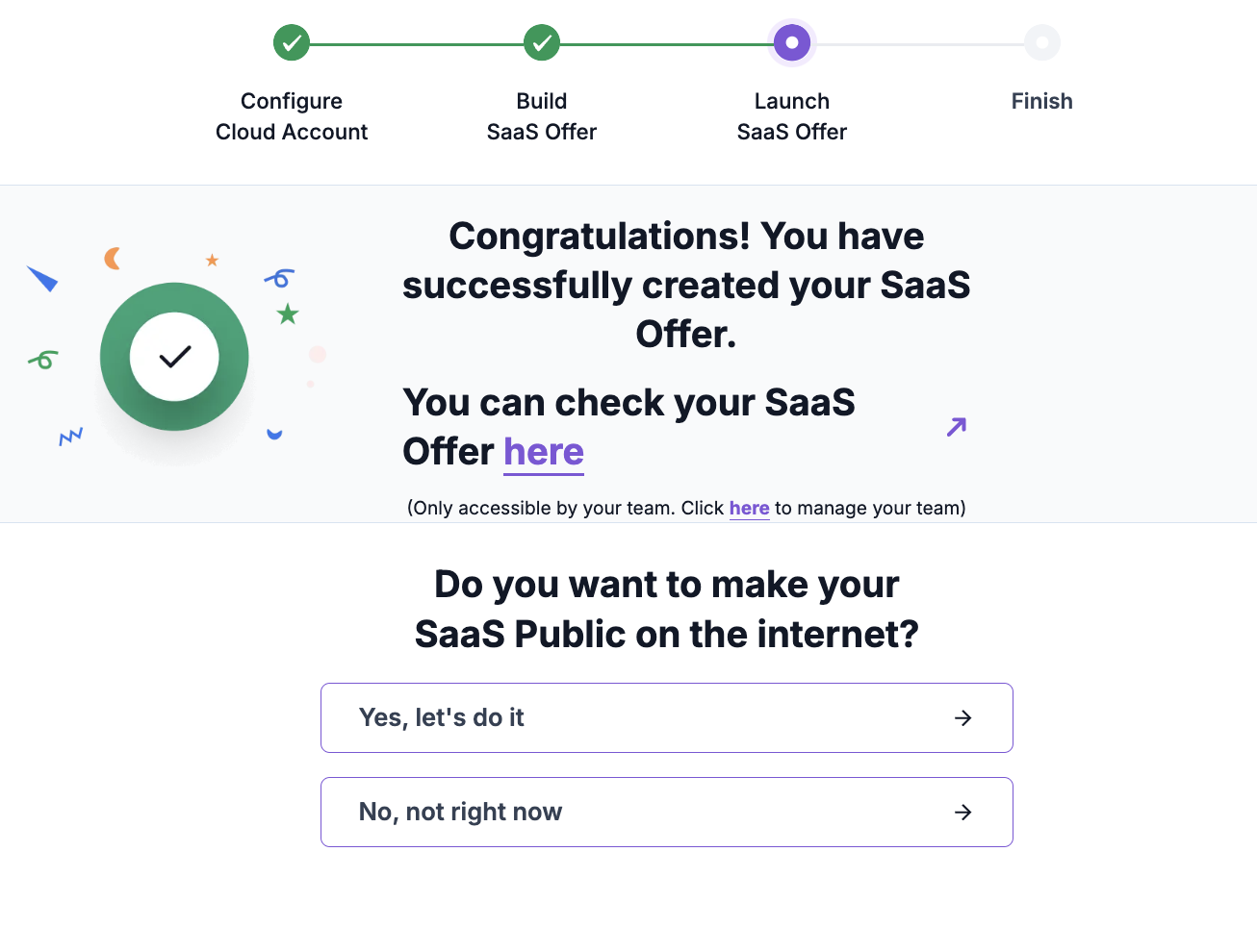Once your SaaS Product has been created, you can optionally decide to make your SaaS Product live for any one to sign-up and access publicly.
